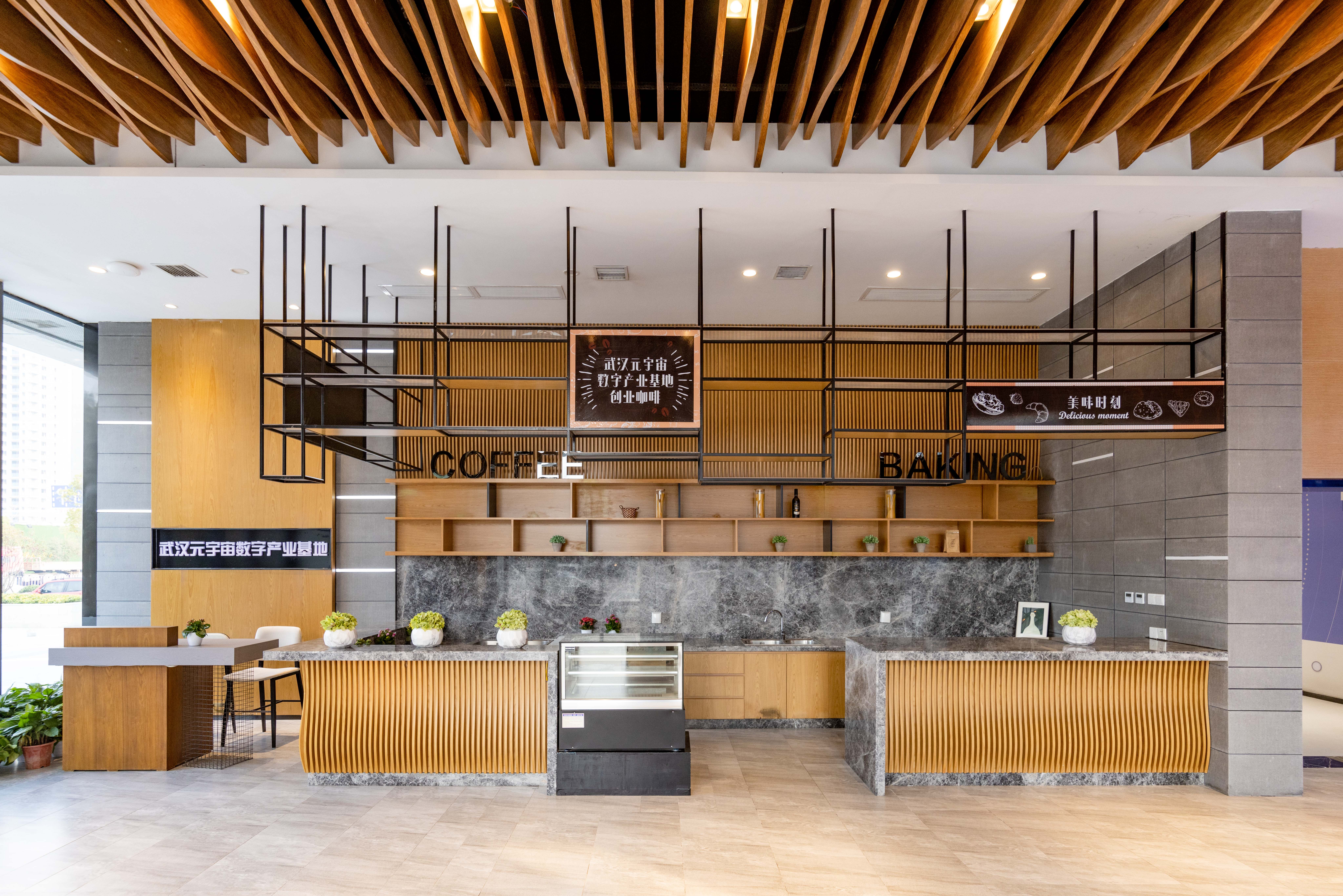 利用不同顏色不同紋理的木紋磚將辦公區(qū)域與休閑區(qū)域進行分割。這樣各功能性分區(qū)都有固定的主要功能,也可安置各自的特色家具。整個空間采用了親和、天然性的裝飾材料,顏色的碰撞、元宇宙元素的融合,創(chuàng)造了具有未來感、幸福感的空間氛圍。
