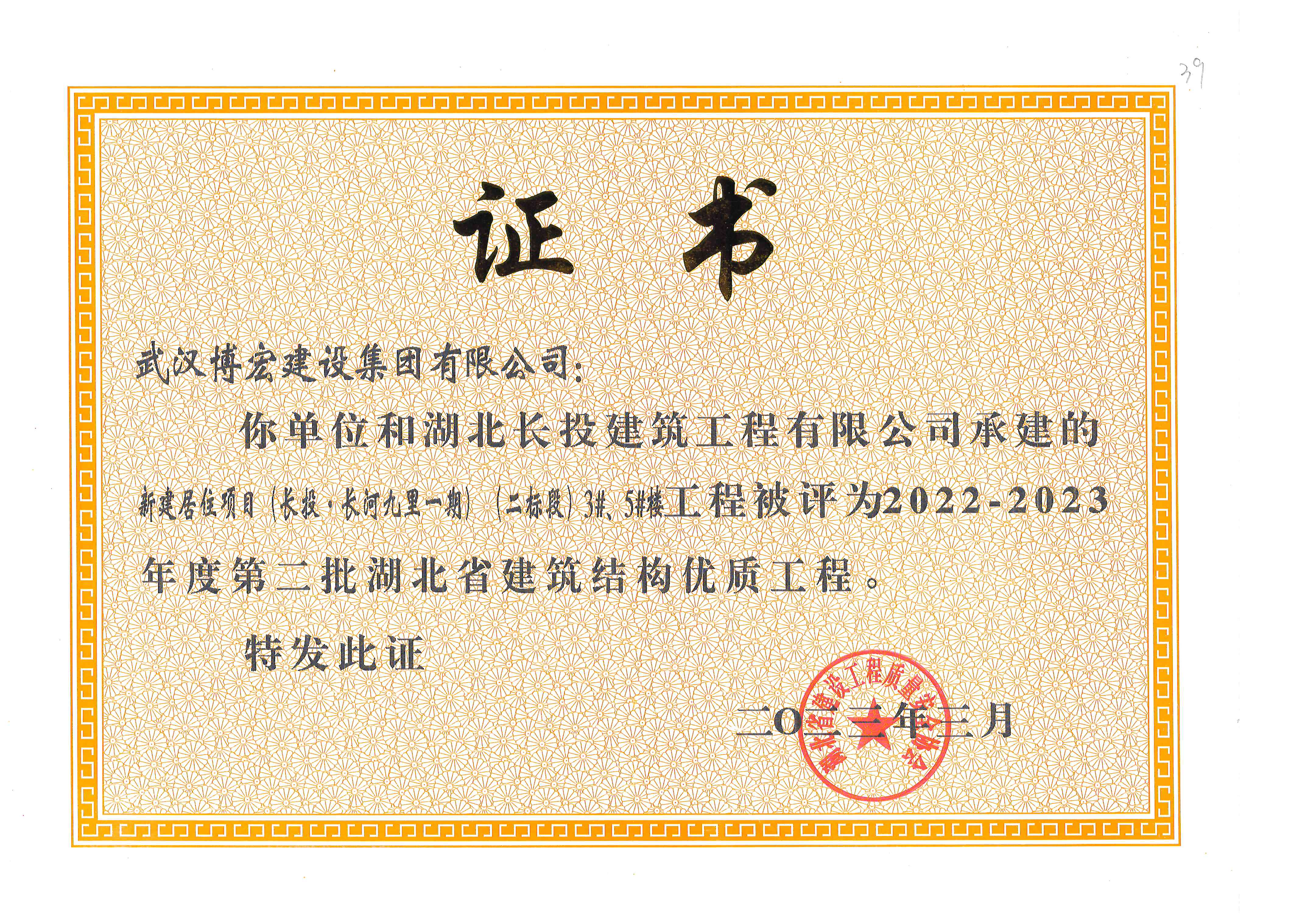 近日,湖北省住建廳2022—2023年度第二批湖北省建筑結構優質工程項目名單出爐,由博宏建設集團承建的武漢市第五醫院改擴建項目(一期)、新建居住項目(長投·長河九里一期)(二標段)3#、5#樓榮獲湖北省建筑結構優質工程獎。“湖北省建筑結構優質工程獎”是湖北省建筑結構工程領域的最高獎項,獲得該獎項標志著該項目在工程結構設計、工程施工管理、材料供應保證、過程質量控制等方面均達到省級領先水平。