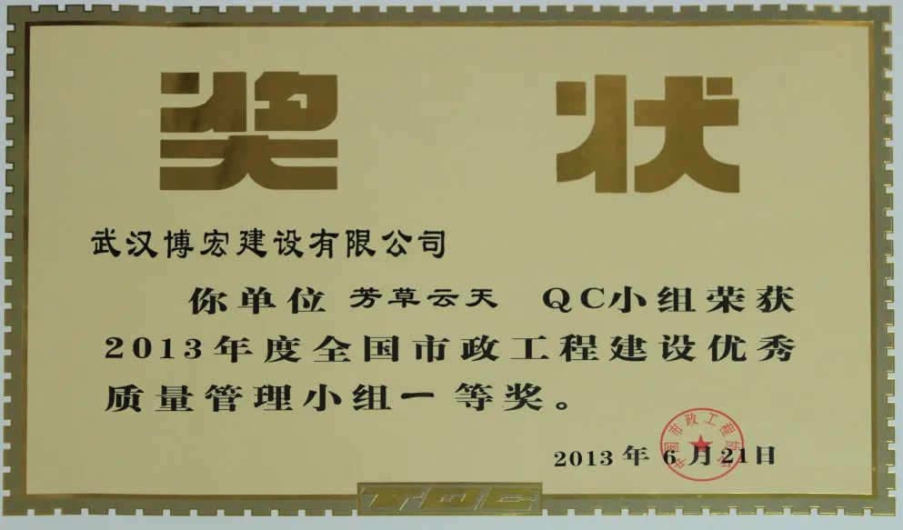 芳草云天QC小組成立于2011年5月31日,本小組從企業(yè)經(jīng)營戰(zhàn)略、方針目標和現(xiàn)場存在的問題出發(fā),以提高效能、降低消耗、實現(xiàn)經(jīng)濟與社會效益雙贏為目的,全面優(yōu)化項目質量。歷年來追求卓越、探索新品,曾獲得2013 年全國市政工程建設協(xié)會優(yōu)秀QC成果一等獎、2014年湖北省市政工程建設優(yōu)秀QC成果二等獎、2015年湖北省市政工程建設優(yōu)秀 QC成果一等獎、2022年度中國施工企業(yè)管理協(xié)會工程建設質量管理小組活動成果二等獎、2022年中國建筑業(yè)工程建設質量管理小組活動成果三等獎等榮譽。
